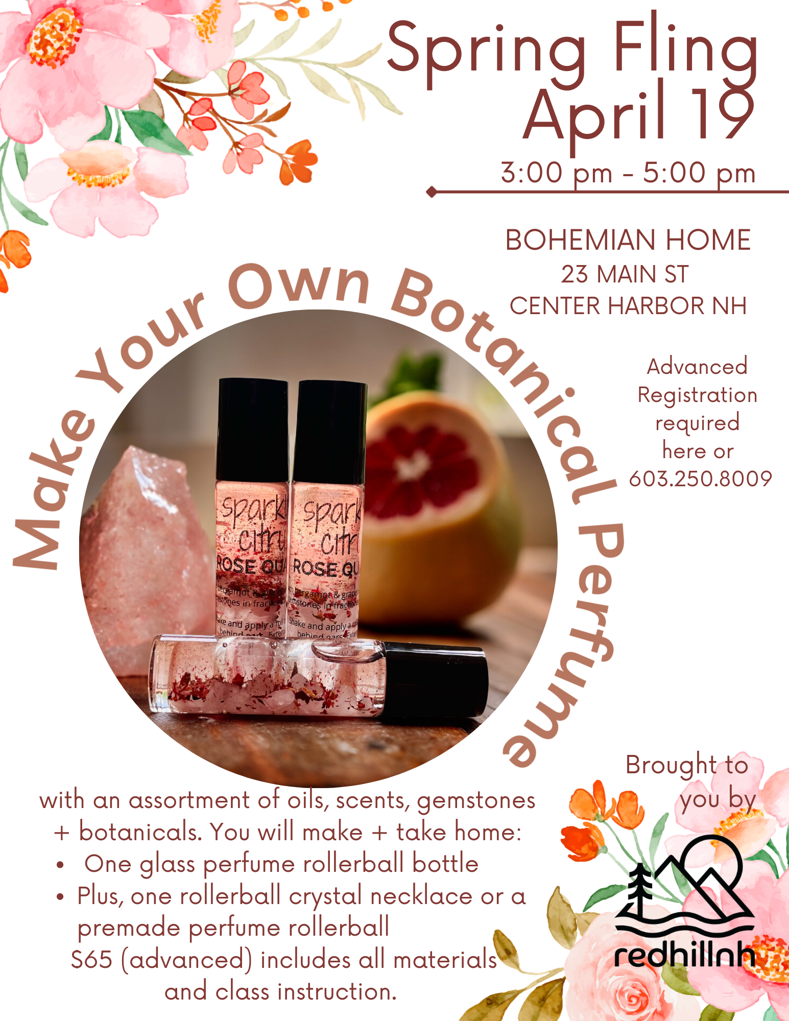 Markets & Events SUNDAY APRIL 19, 20263 pm - 5 pmBohemian Home, Center Harbor, NHJoin us for a fun DIY afternoon to Make Your Own Perfume roller.Advanced sign up required- space is limited to 10 people.Register at Bohemian Home or by calling 603-250-8009 Tamworth Farmers Market SATURDAY 9 am - Noon2026 datesJune 27July 4, 18August 1, 15, 22September 5held outside at UUFES, 30 Tamworth Rd, Tamworth NH Make Your Own Botanical Perfumes