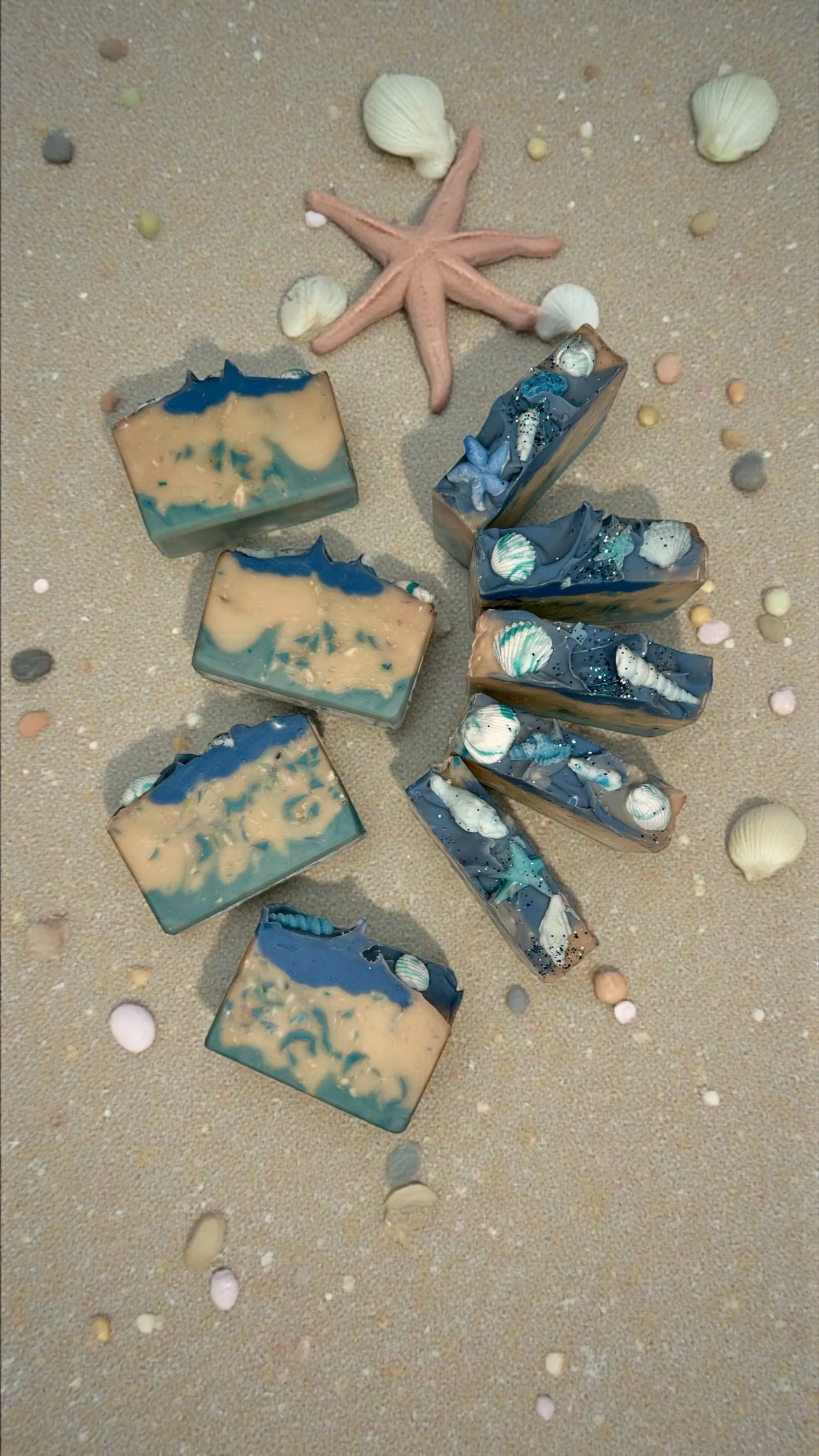 Escape to a tranquil seaside retreat with Beachy Vibes, a luxurious vegan soap adorned with miniature soap shells and topped with biodegradable glitter, this bar offers a touch of coastal charm and sparkle.