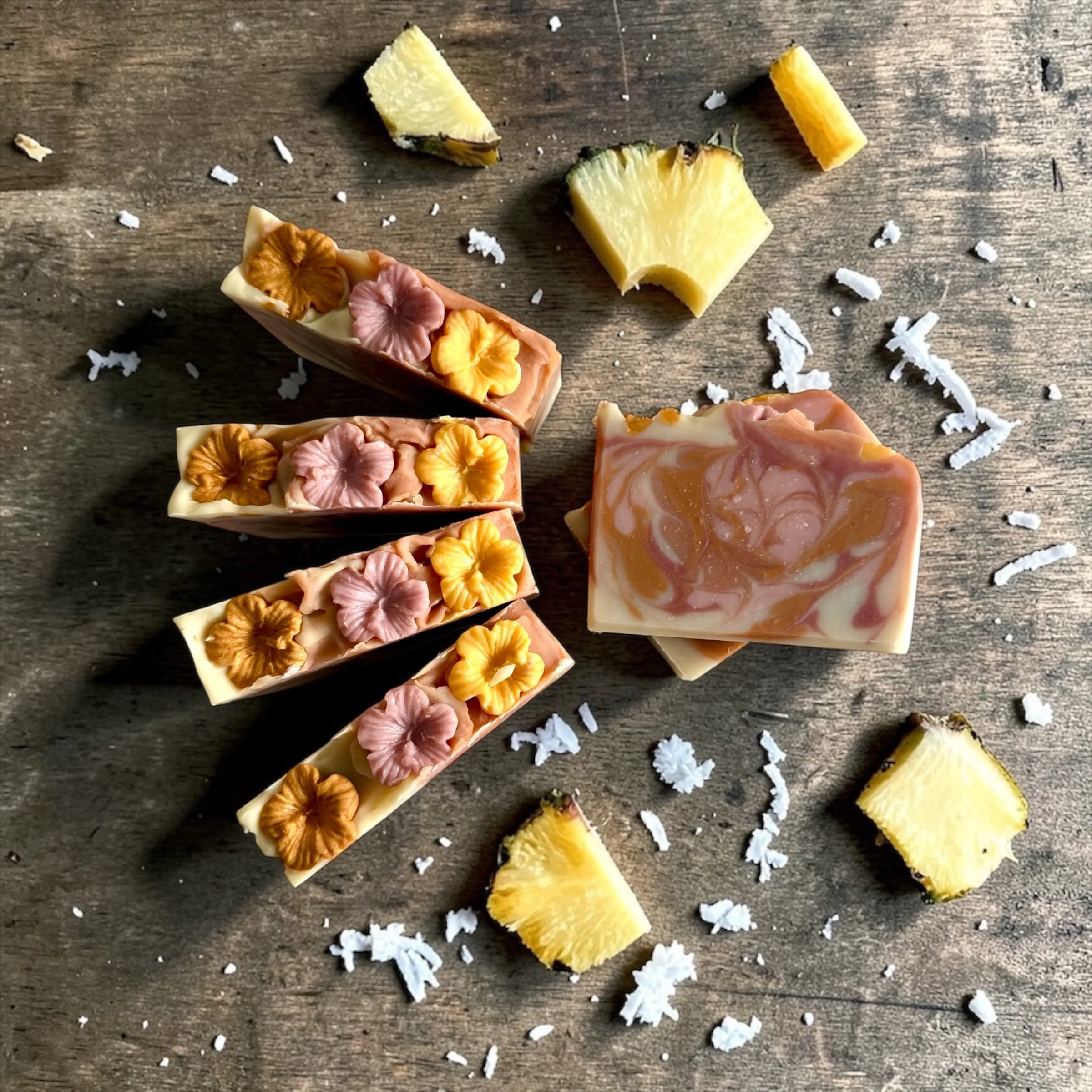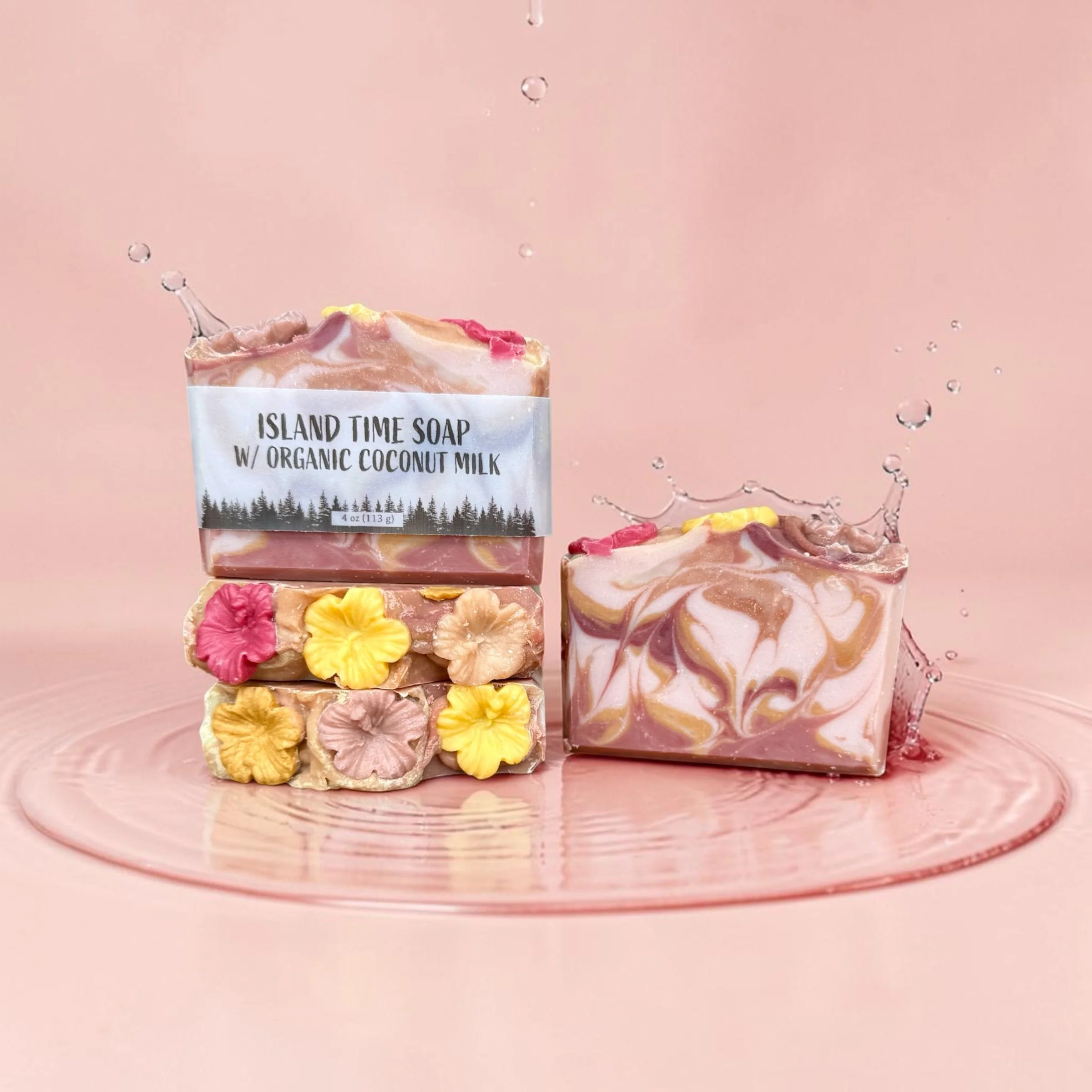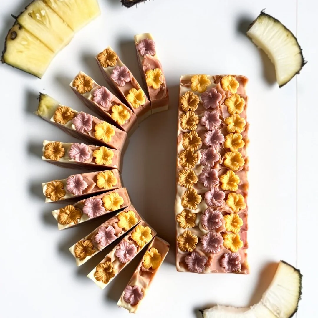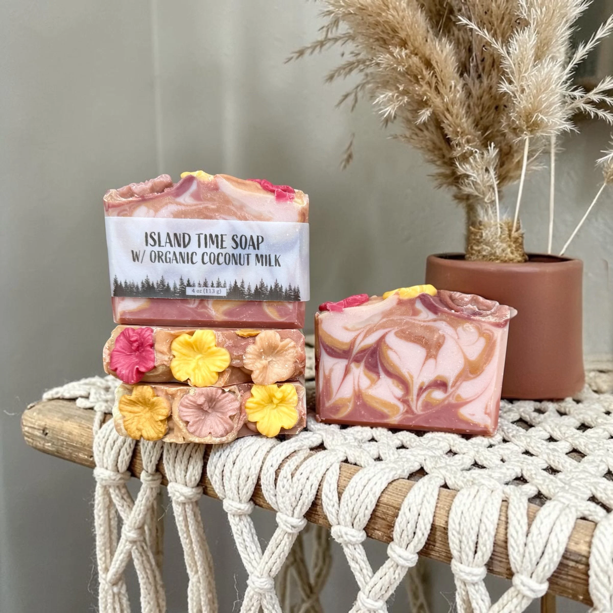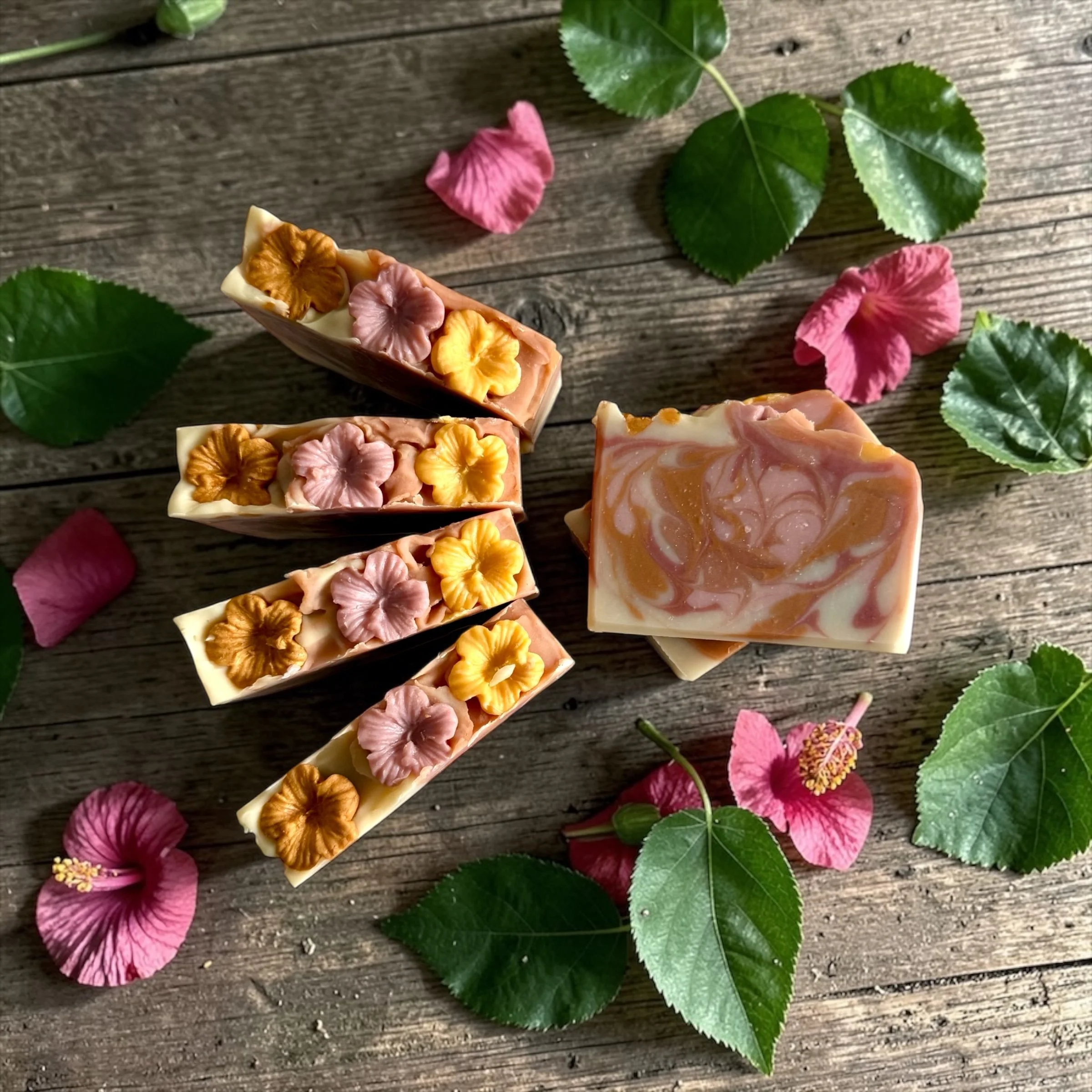Each bar is beautifully swirled in boho-inspired neutrals—dusty rose and warm beige tones—evoking sandy shores and sunset skies. Topped with delicate mini hibiscus soap flowers, it’s a little piece of paradise in every wash.