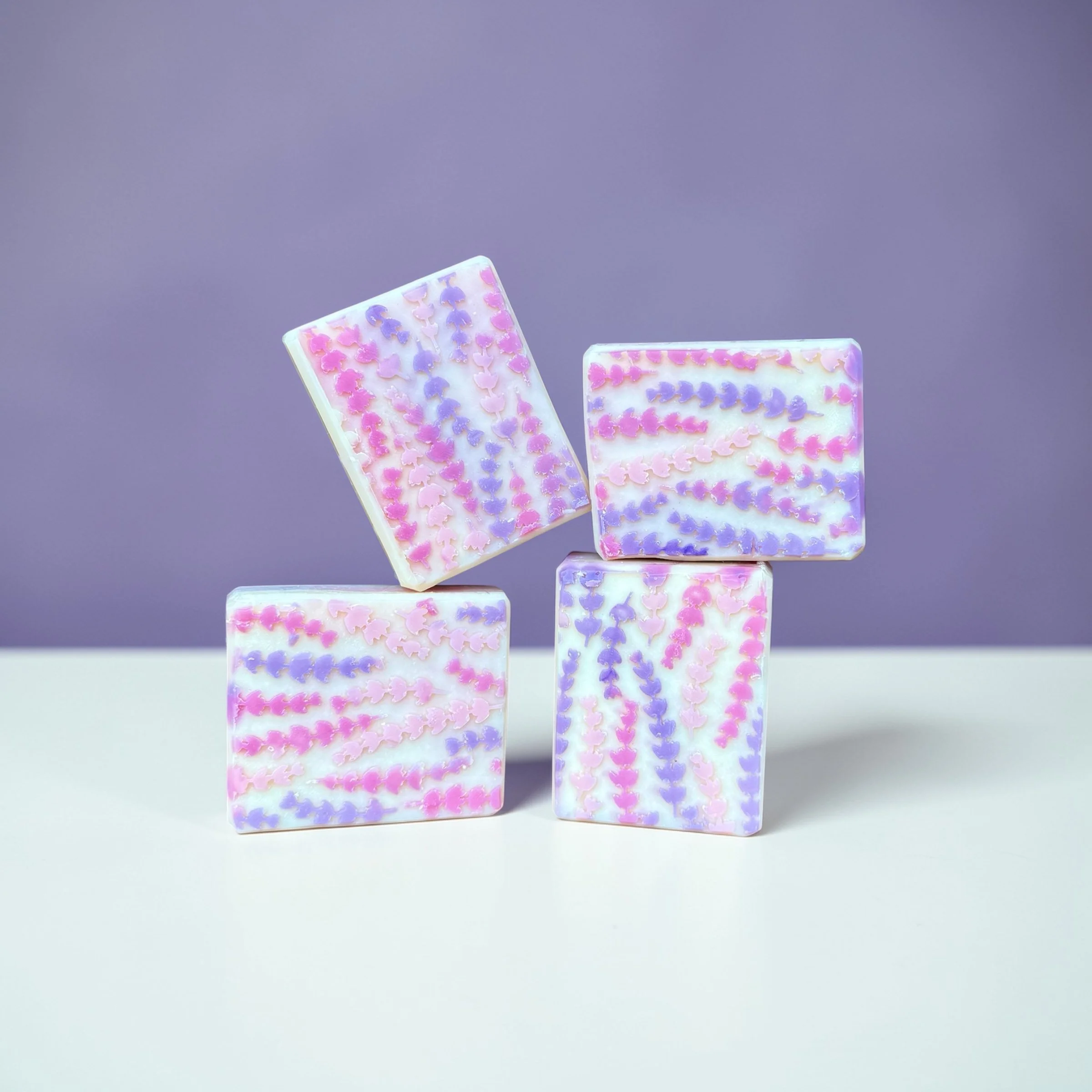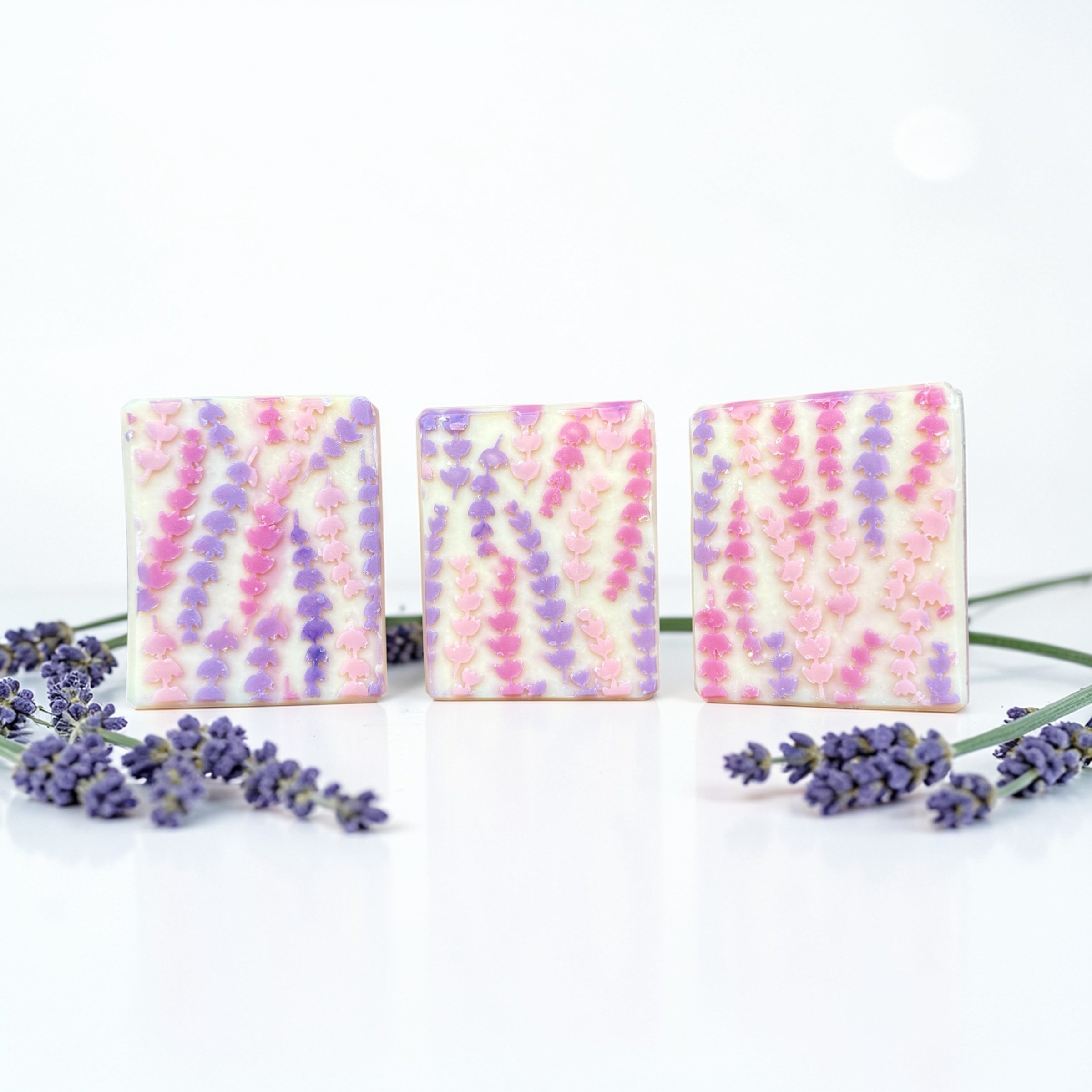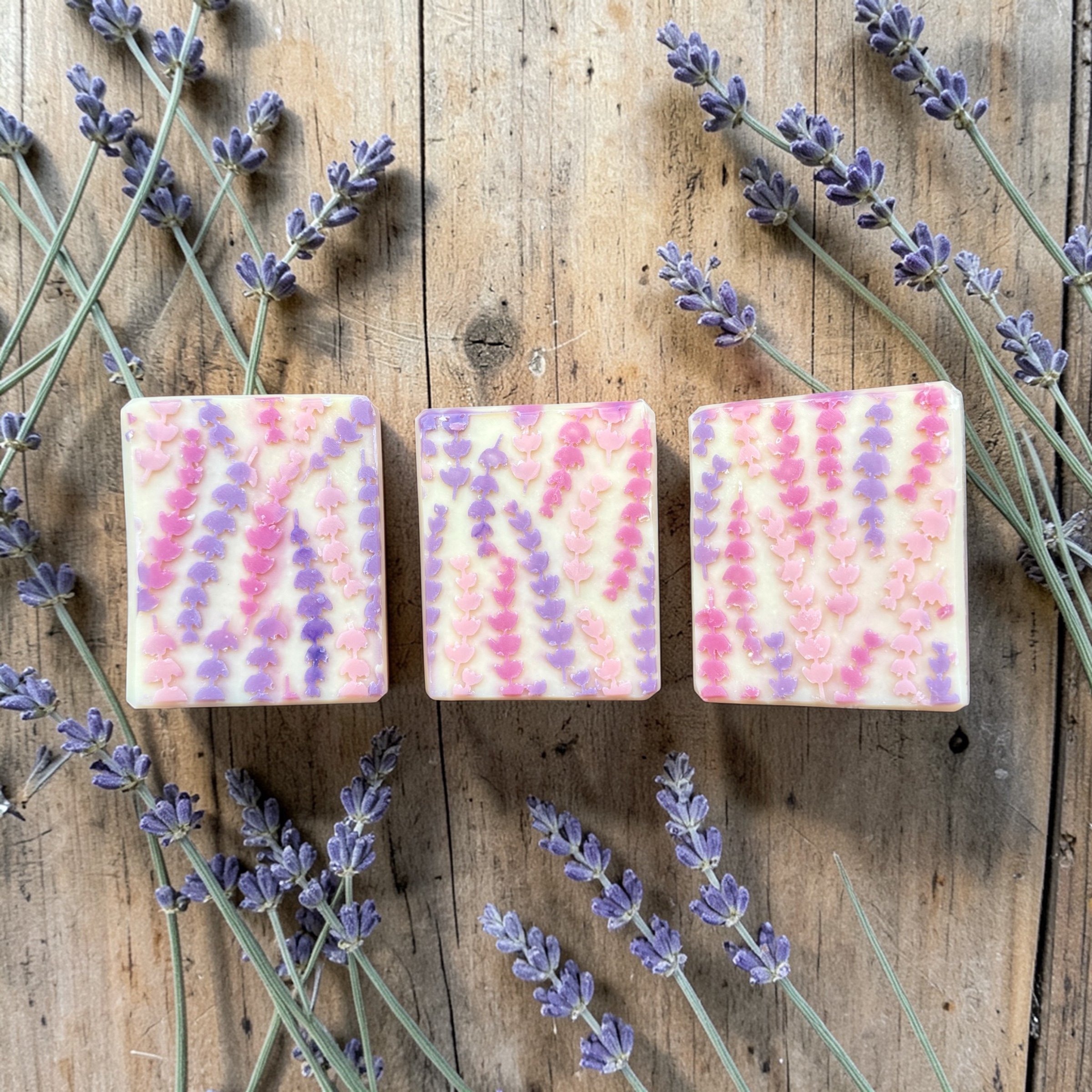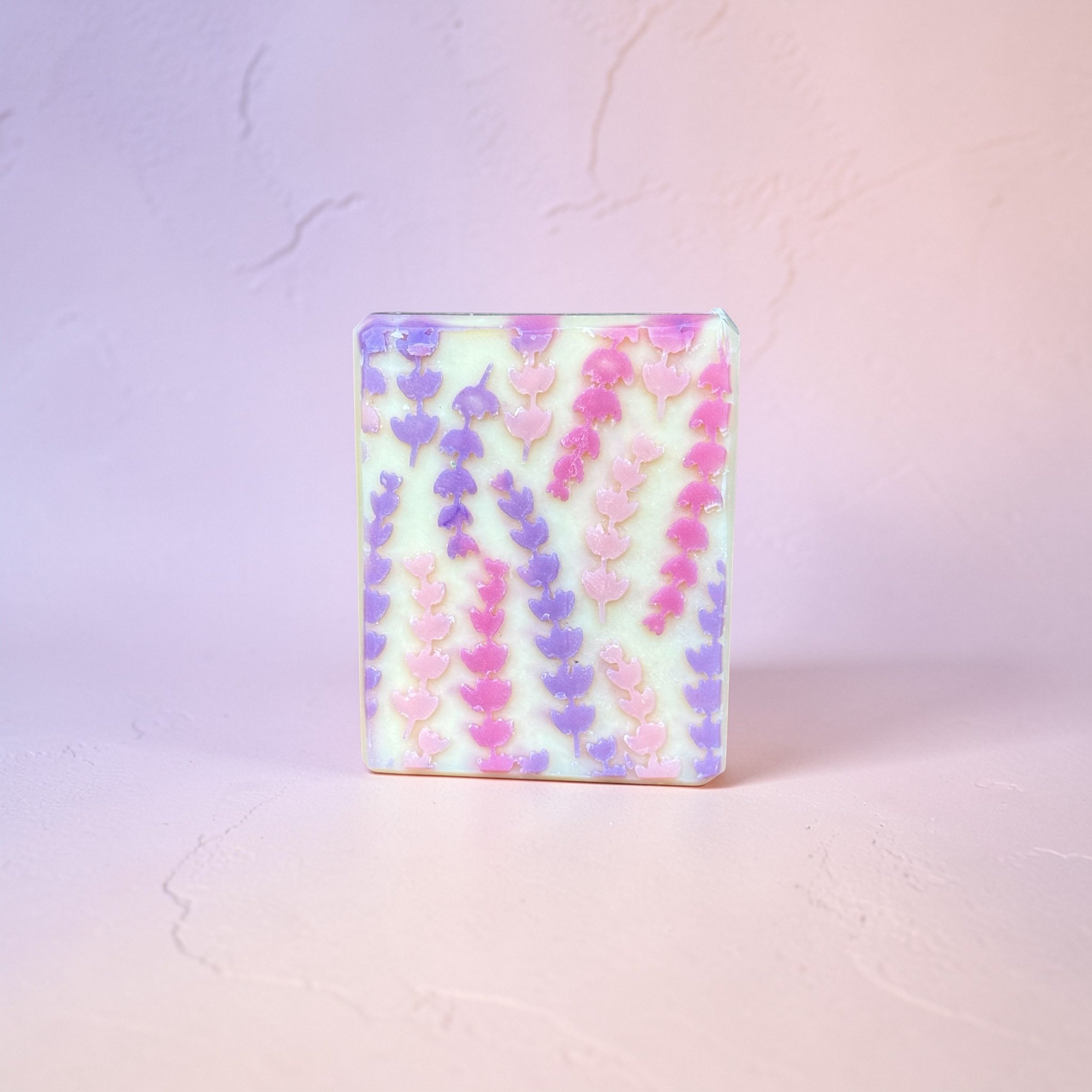 Step into a peaceful countryside escape with Lavender Fields Soap—a calming, skin-loving bar inspired by rolling fields in bloom. This creamy white soap is crowned with delicate purple and pink lavender sprigs, making each bar as beautiful as it is skin loving.