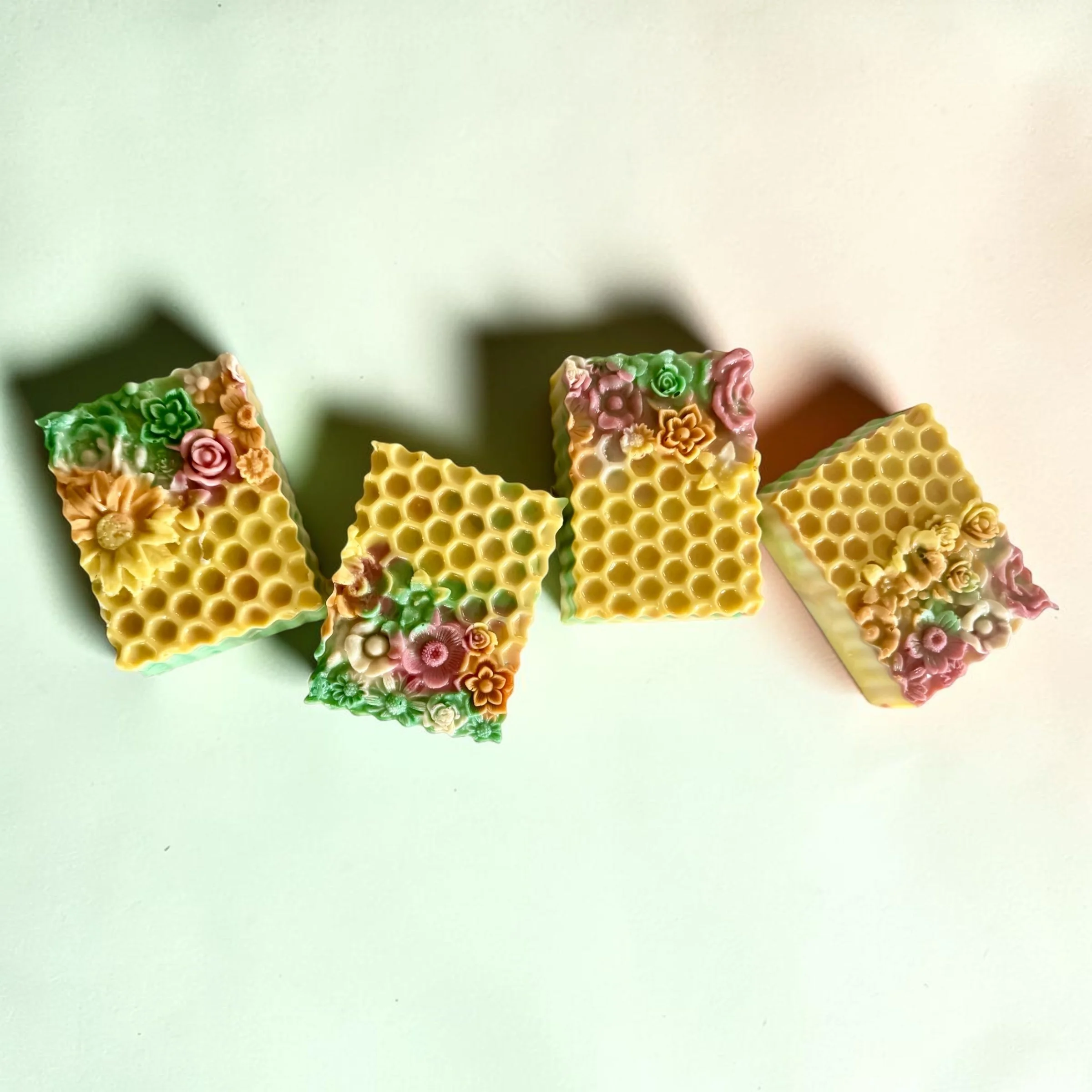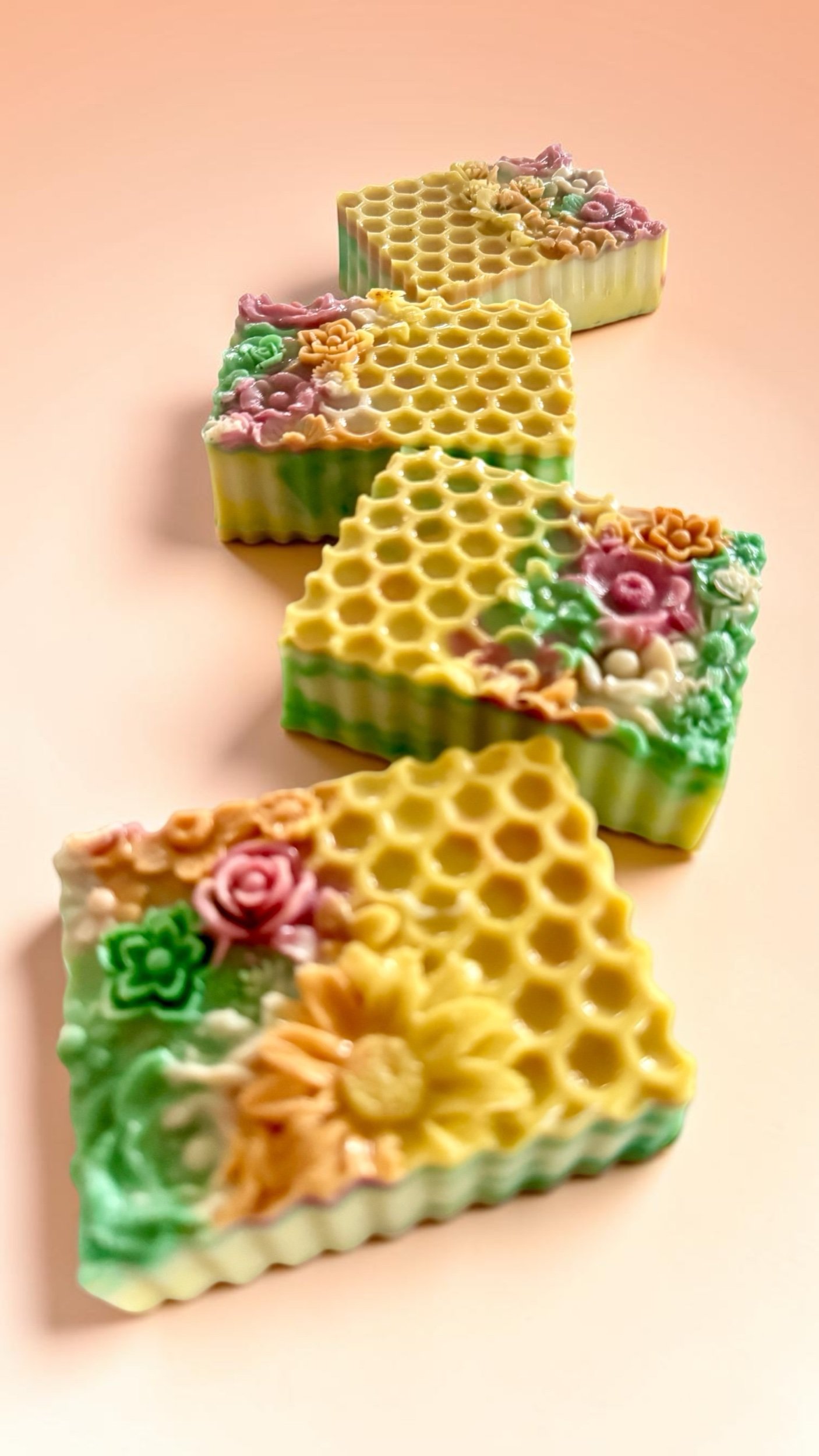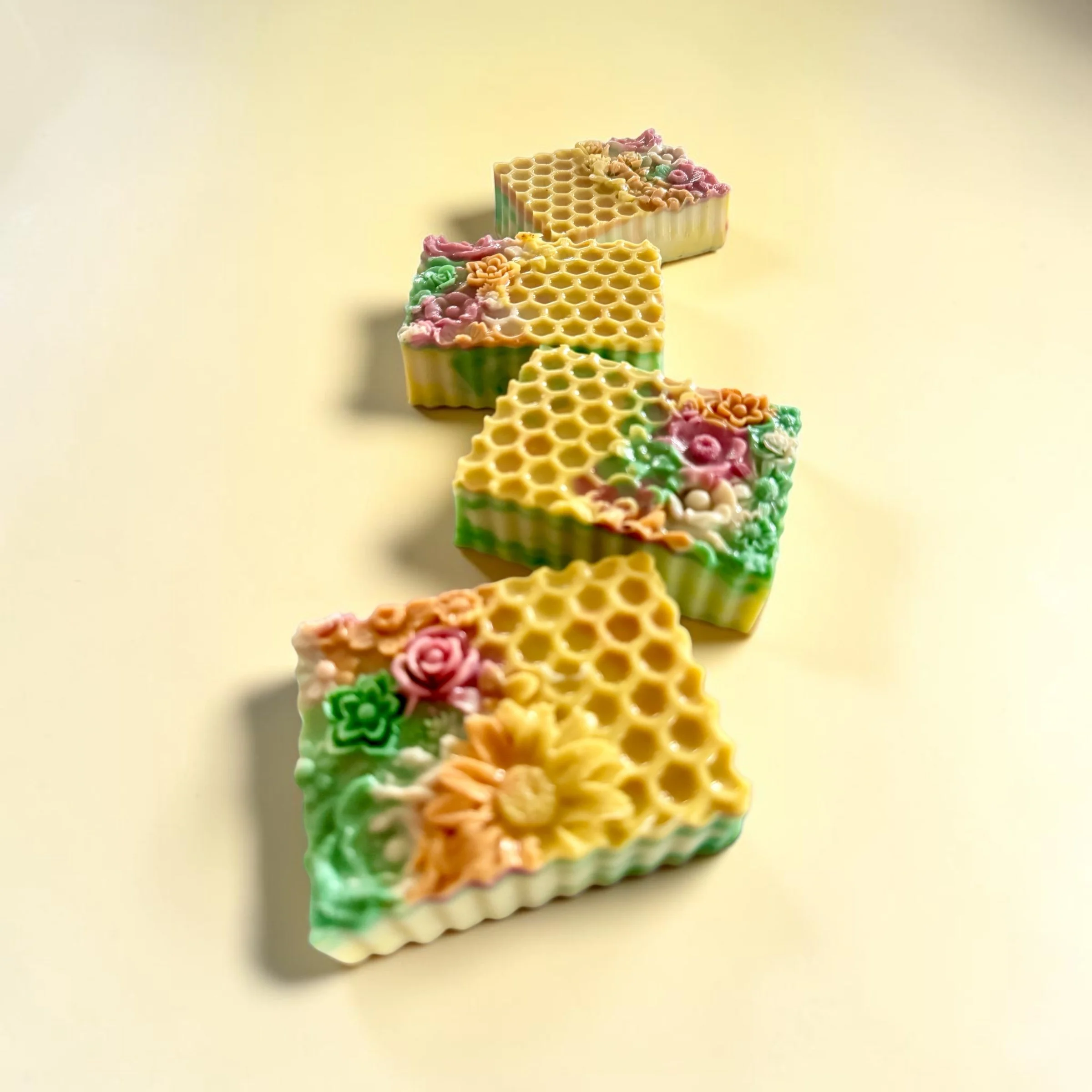 Each bar features charming crinkle-cut edges for a handcrafted feel and is topped with a sweet honeycomb design, dotted with delicate pastel flowers—an ode to the busy little pollinators that make it all possible.